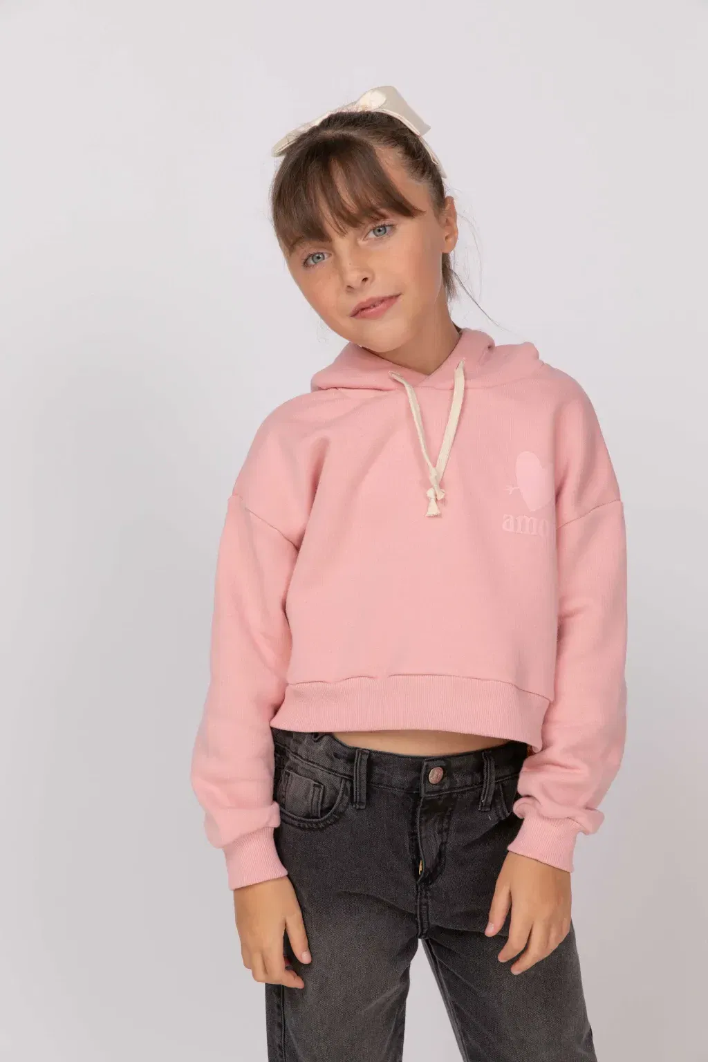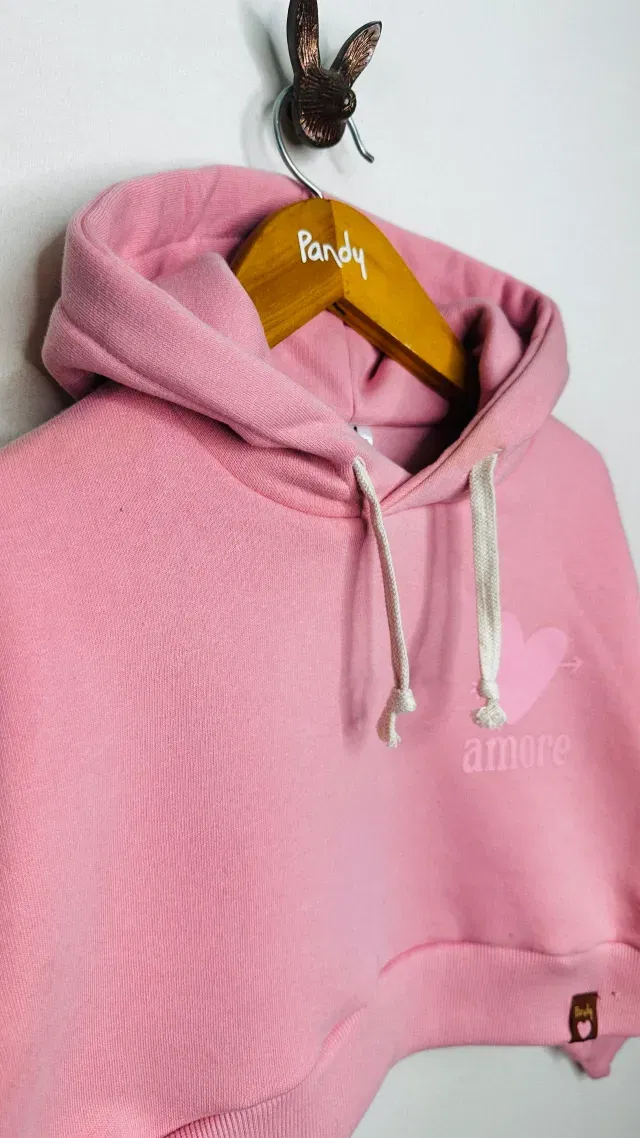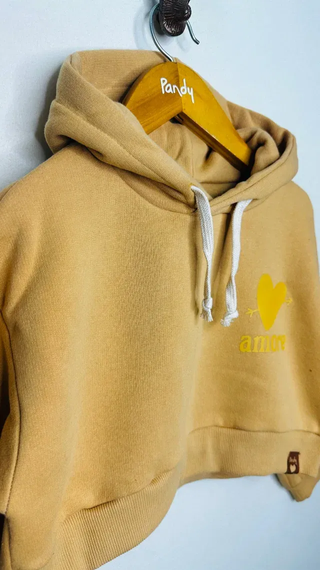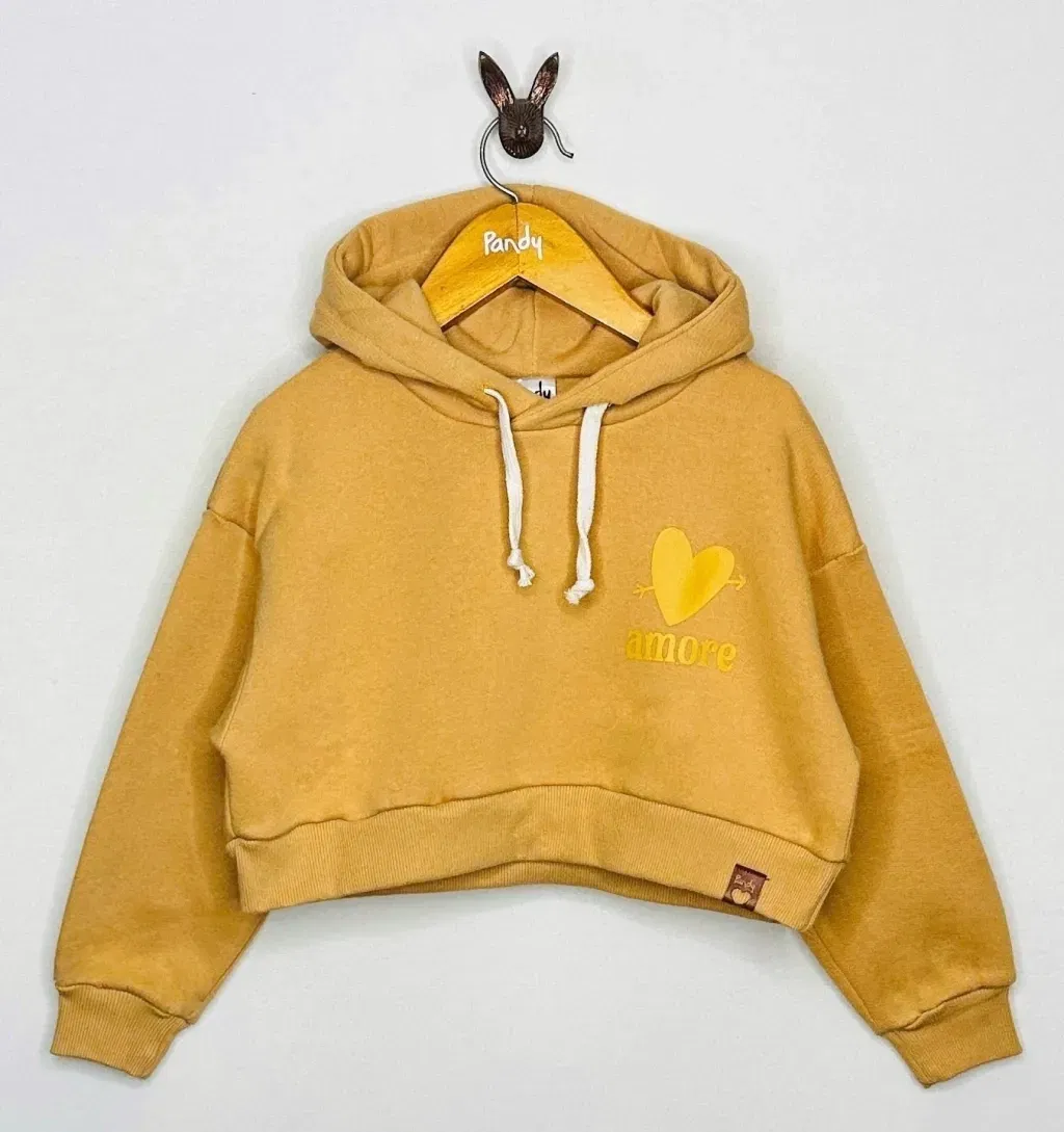 Buzo de nena corto de frisa algodón/polyester lisa color con capucha y estampa en delantero a un color, monocolor.