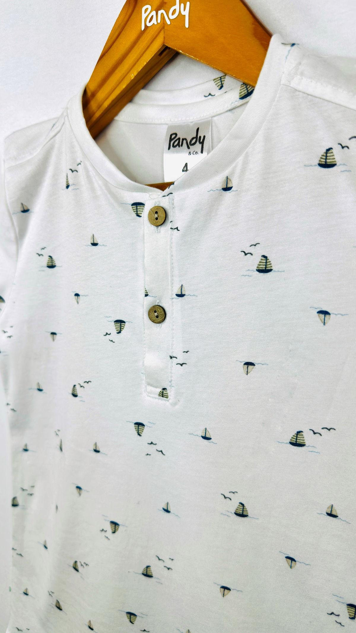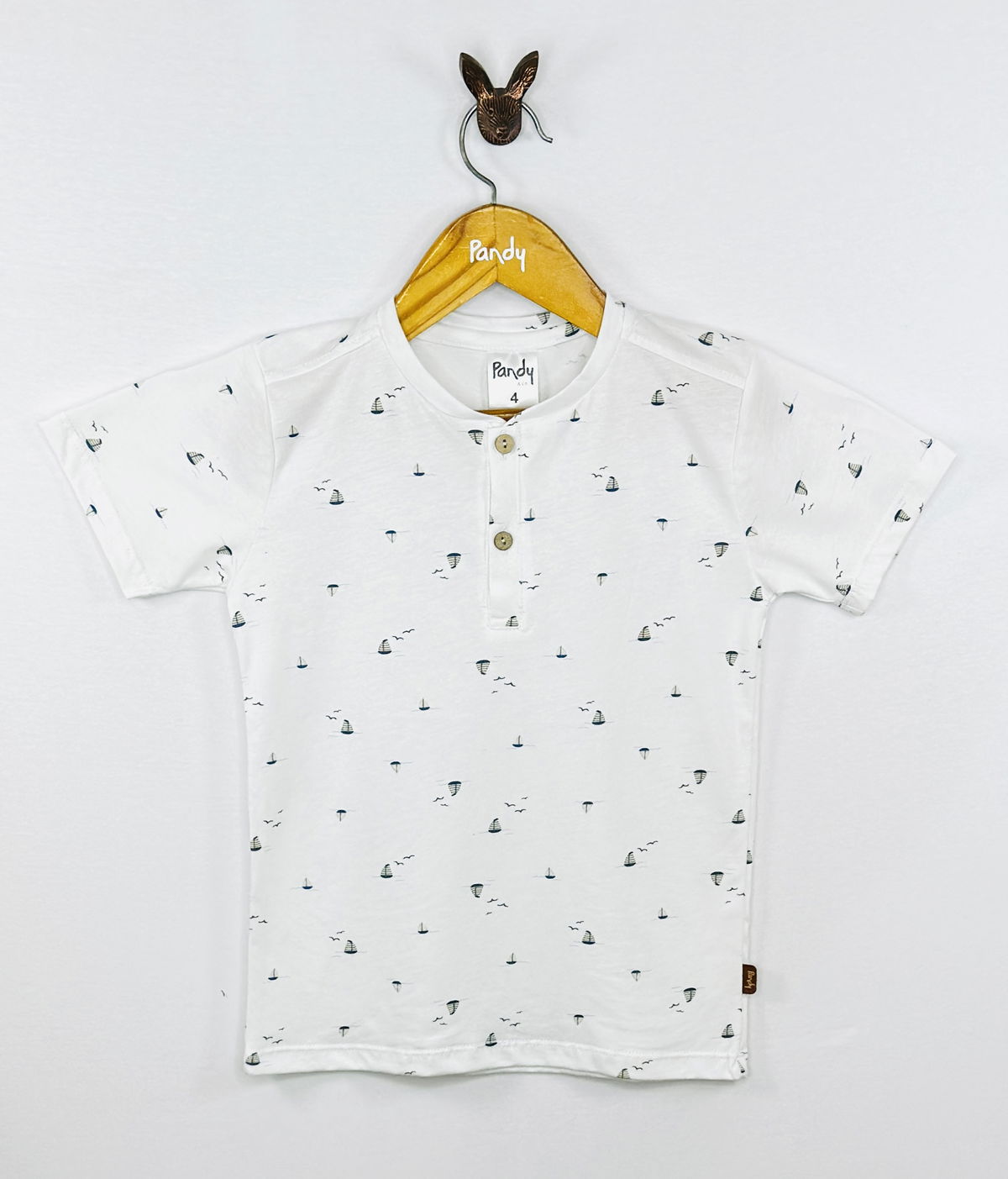 Remera bebe jersey estampado, con cartera y botones simil madera, detelle en manga, dobladillo con atraque.