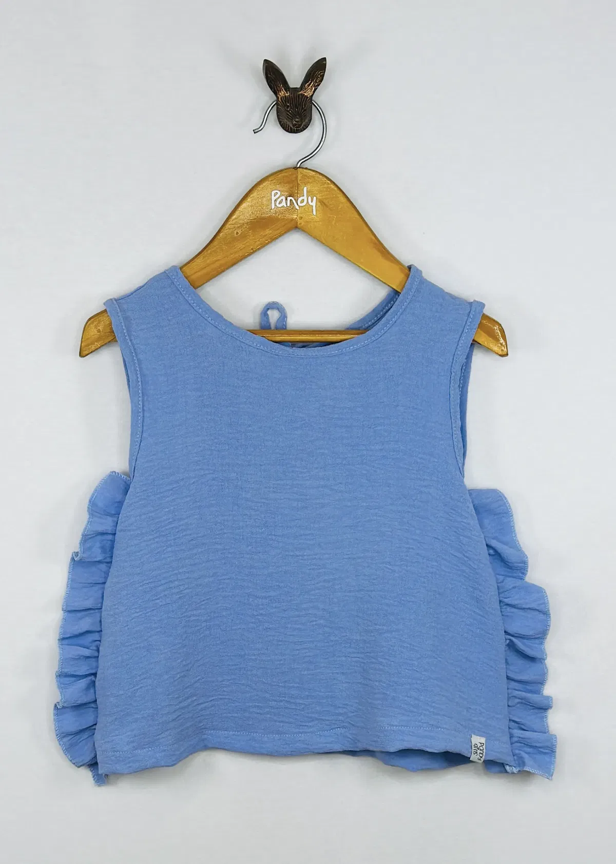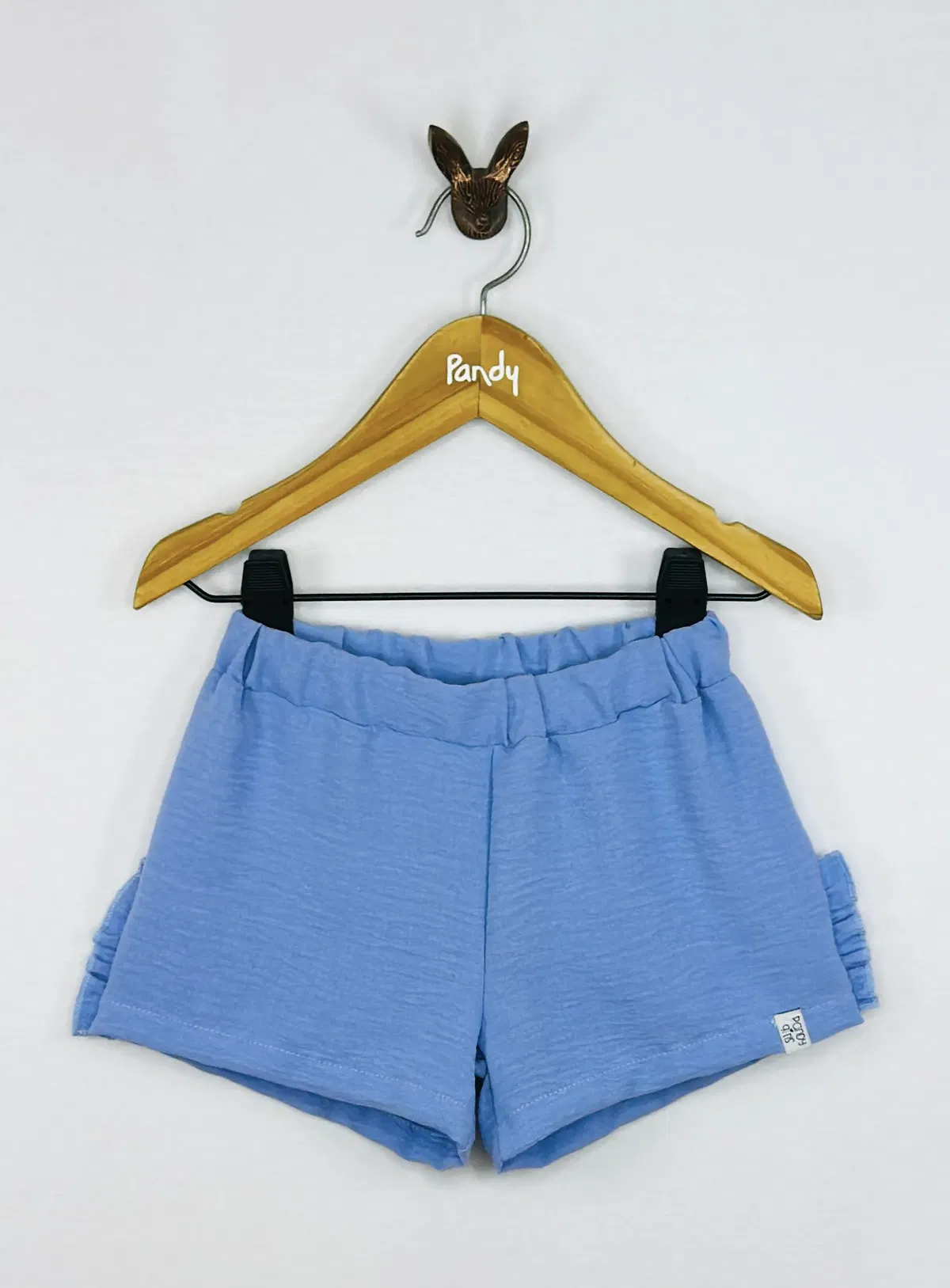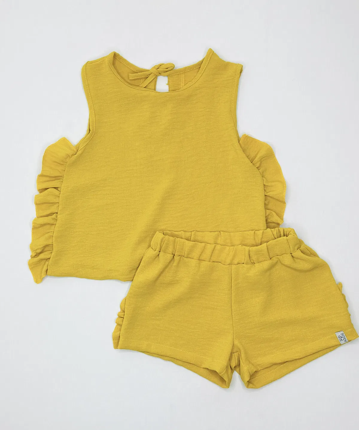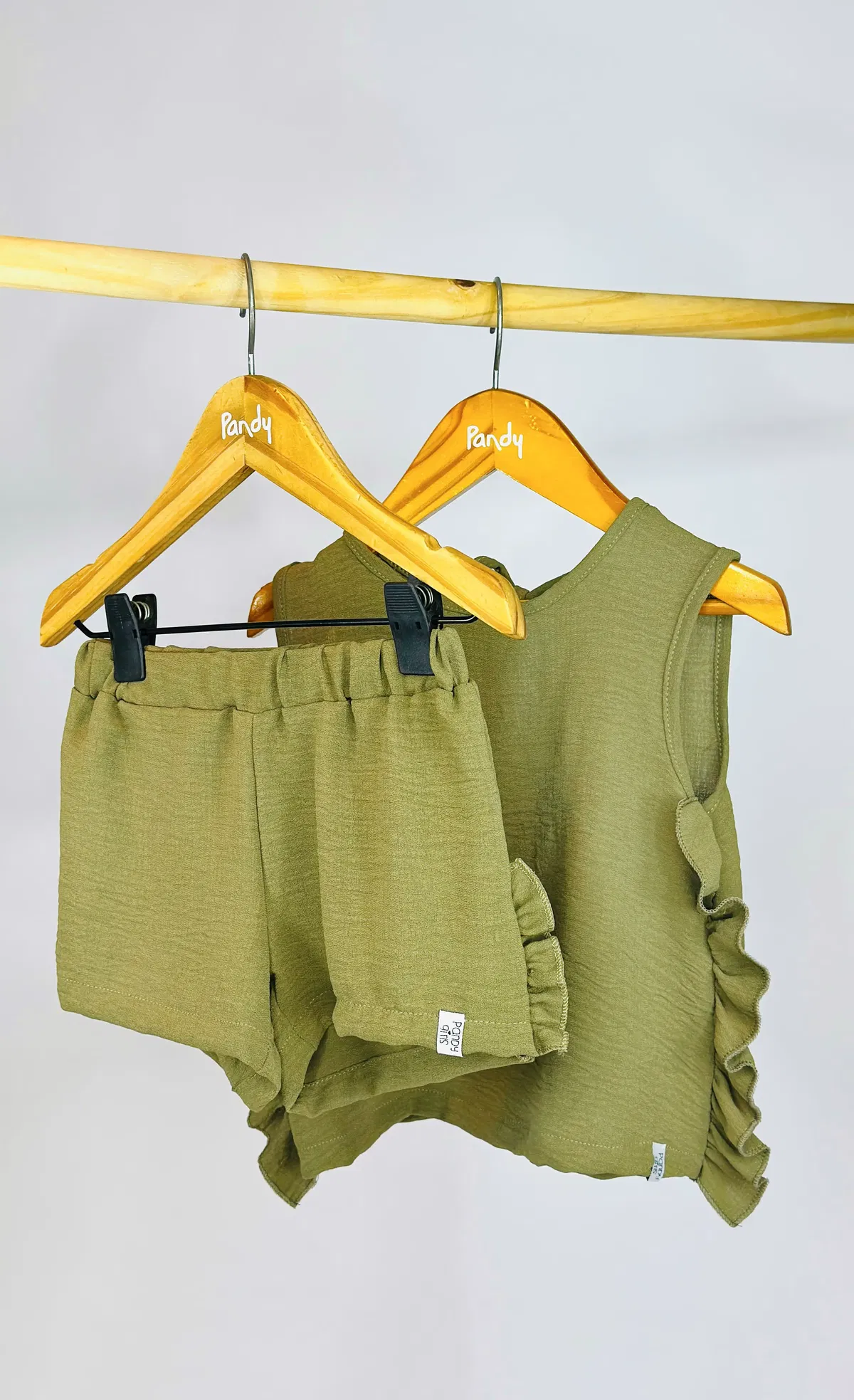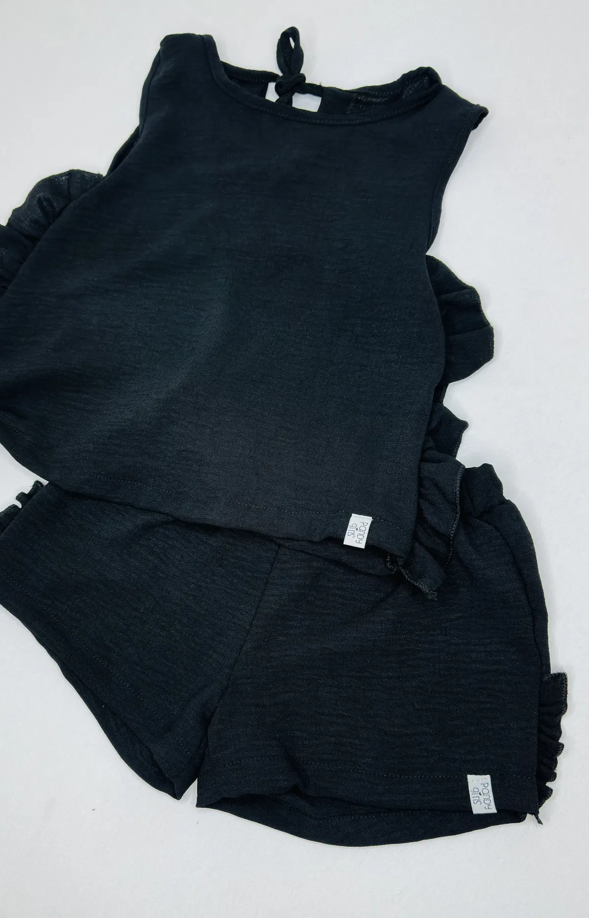 Conjunto nena Creppe de Lino, voladitos laterles en musculosa y short.