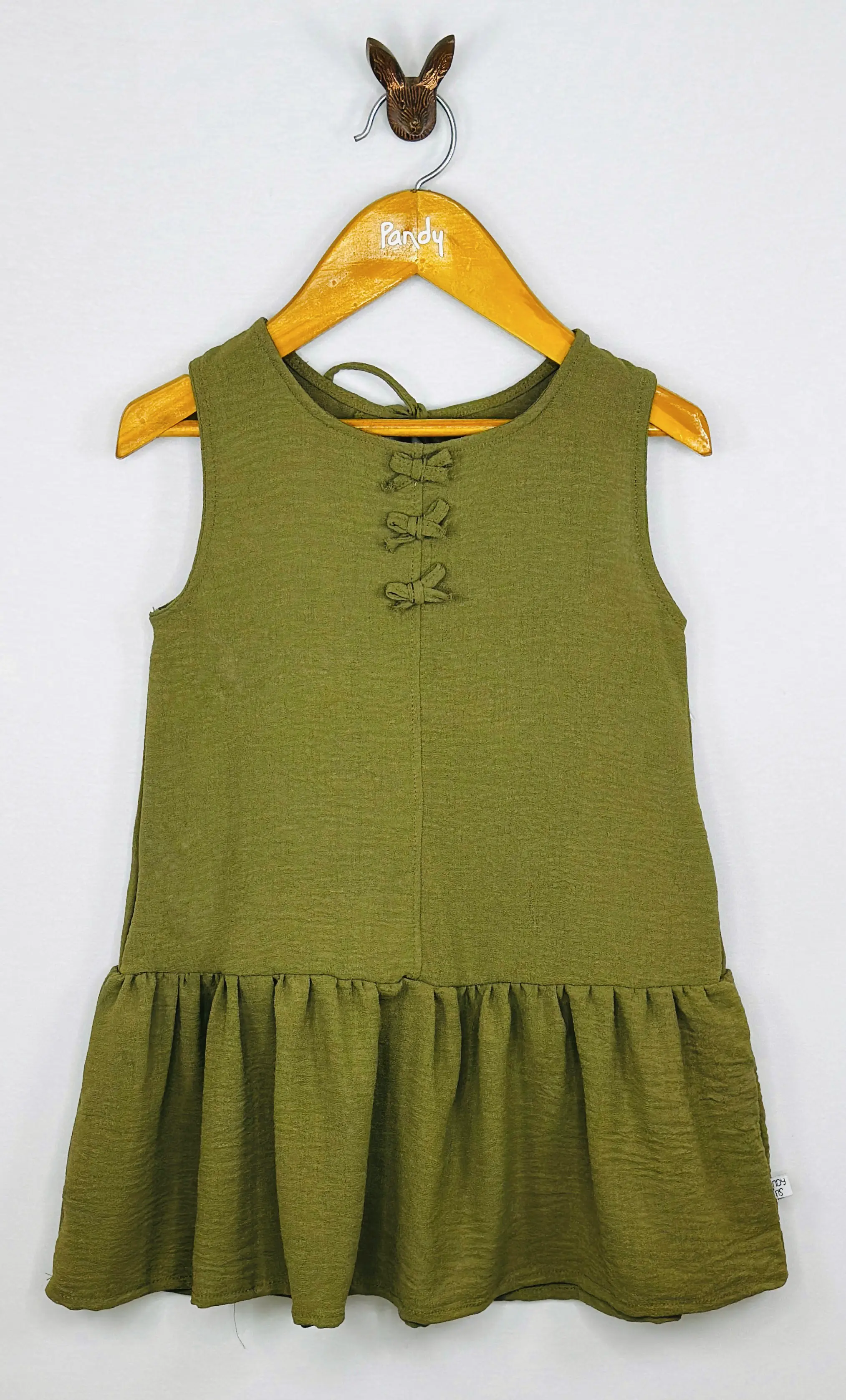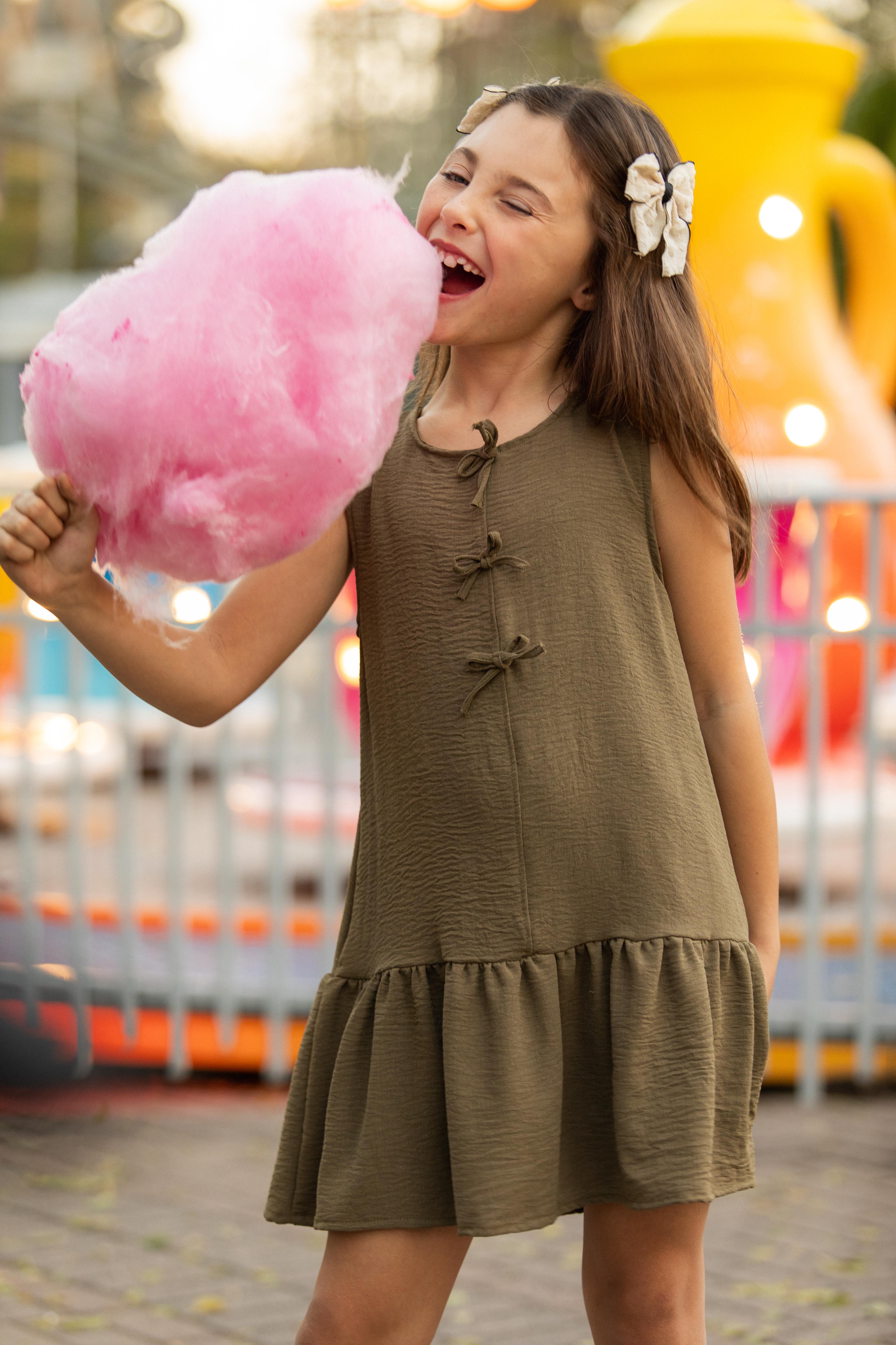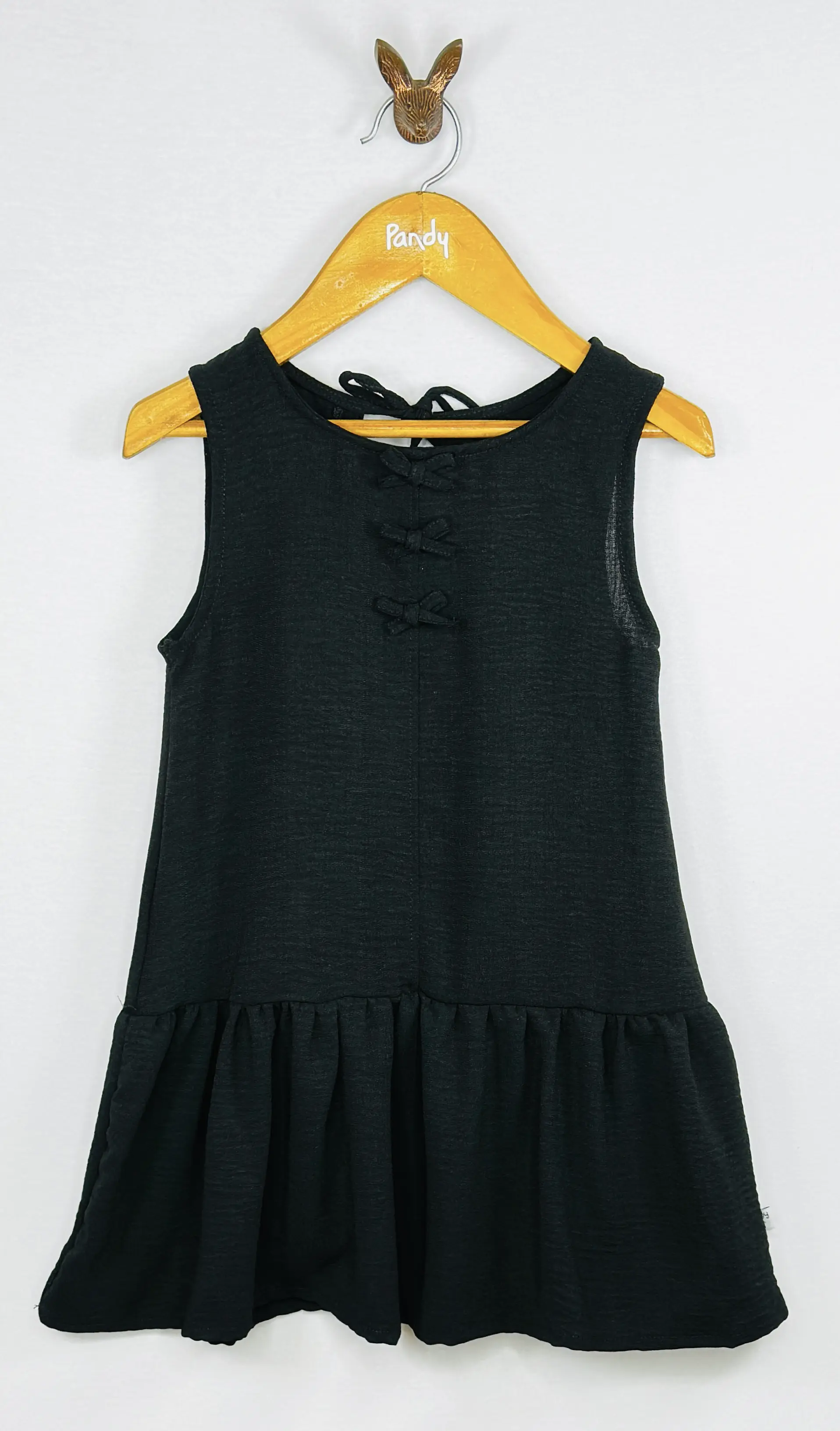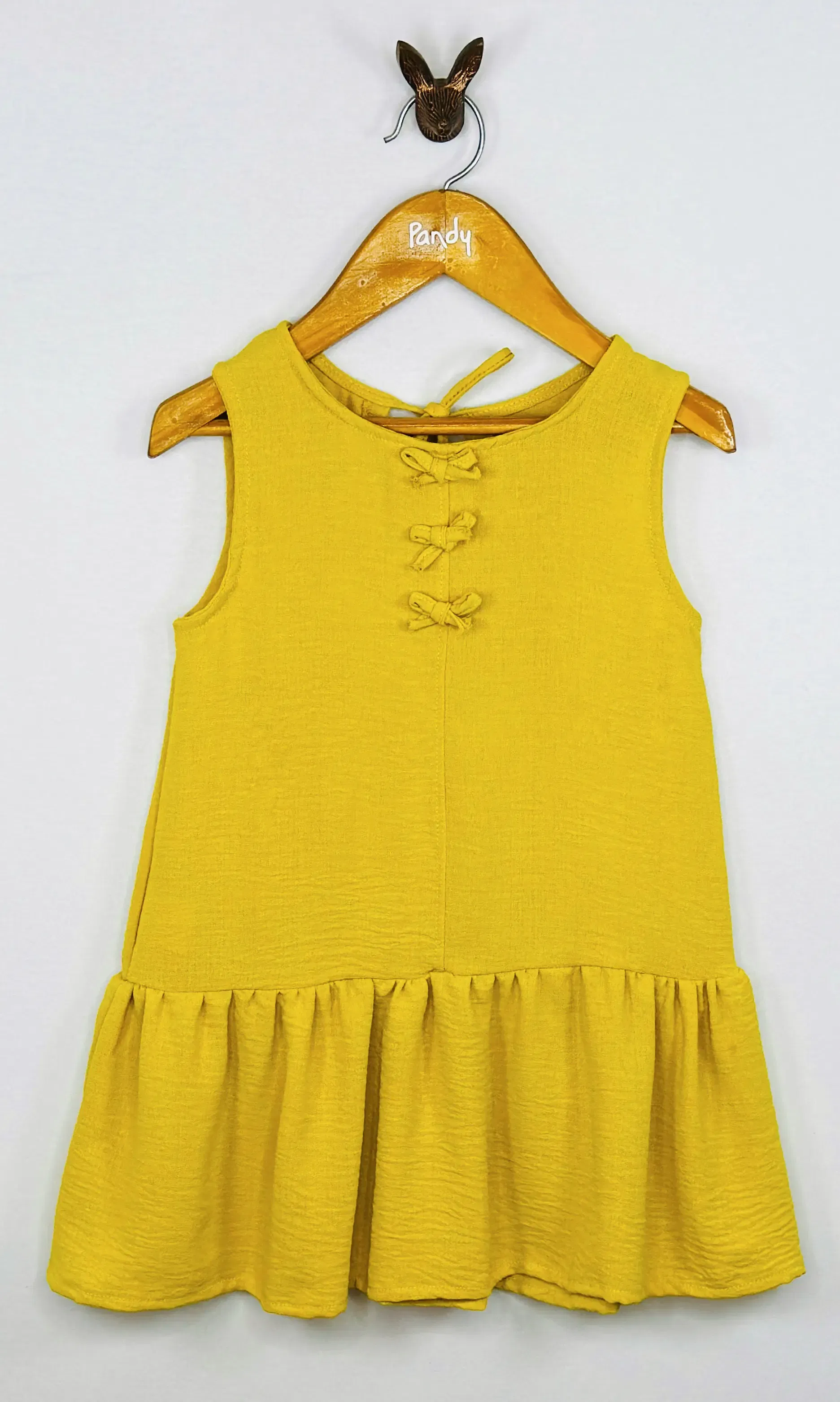 Vestido Nena en simil Lino, con volado y aplique de moños de la misma tela. espalda con gota y lazo para atar.