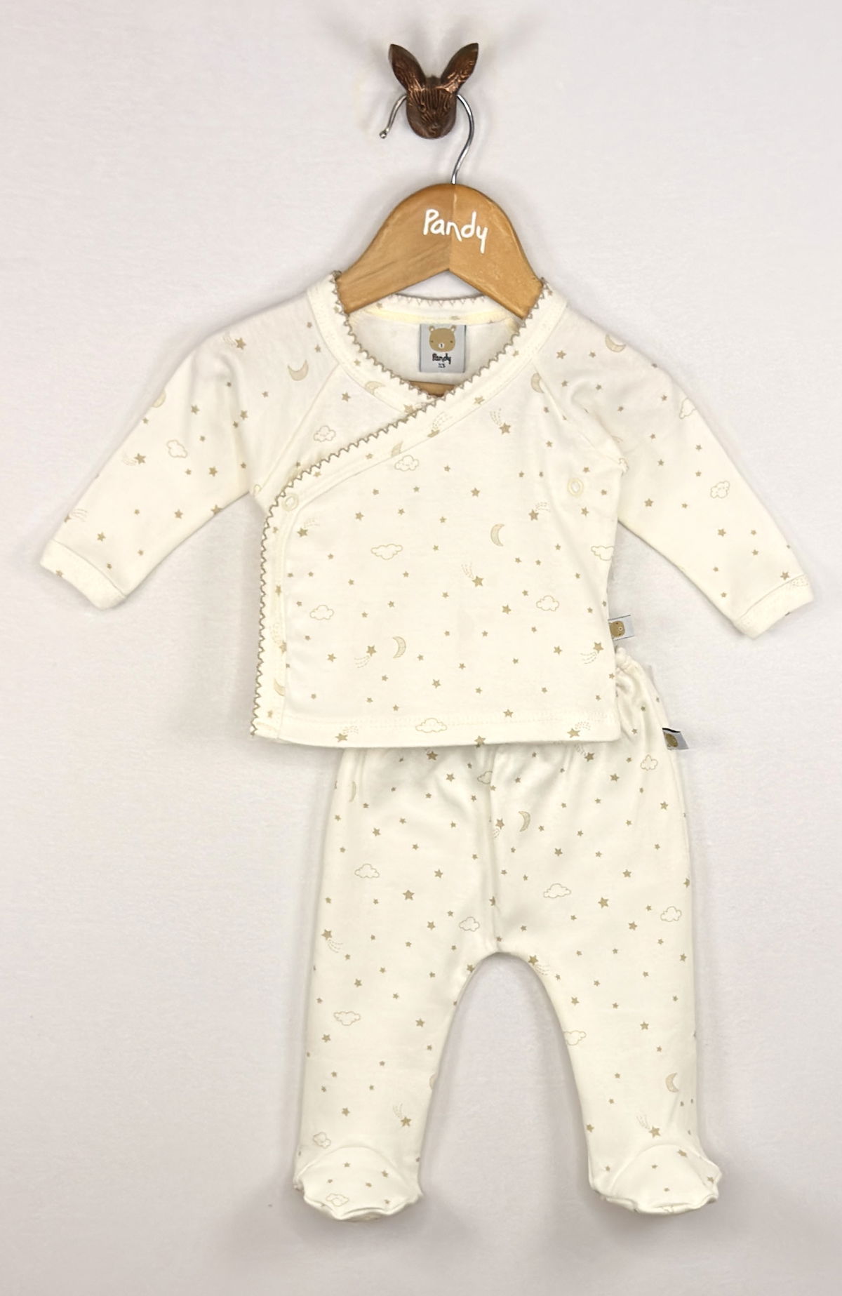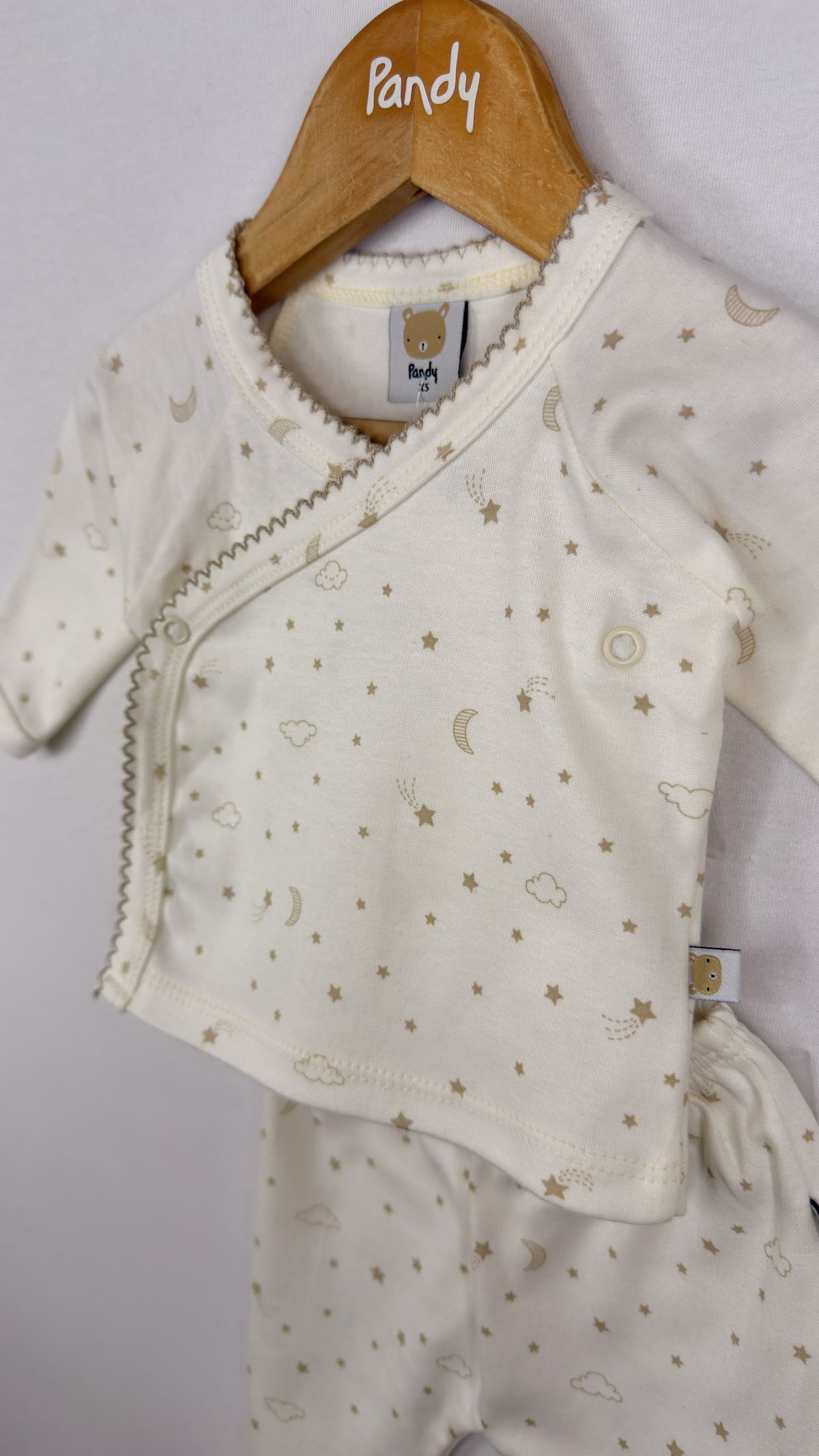 Conjunto de camisetita cruzada manga larga con picot + Ranita con pie, de interlock 100% algodón PIMA estampado