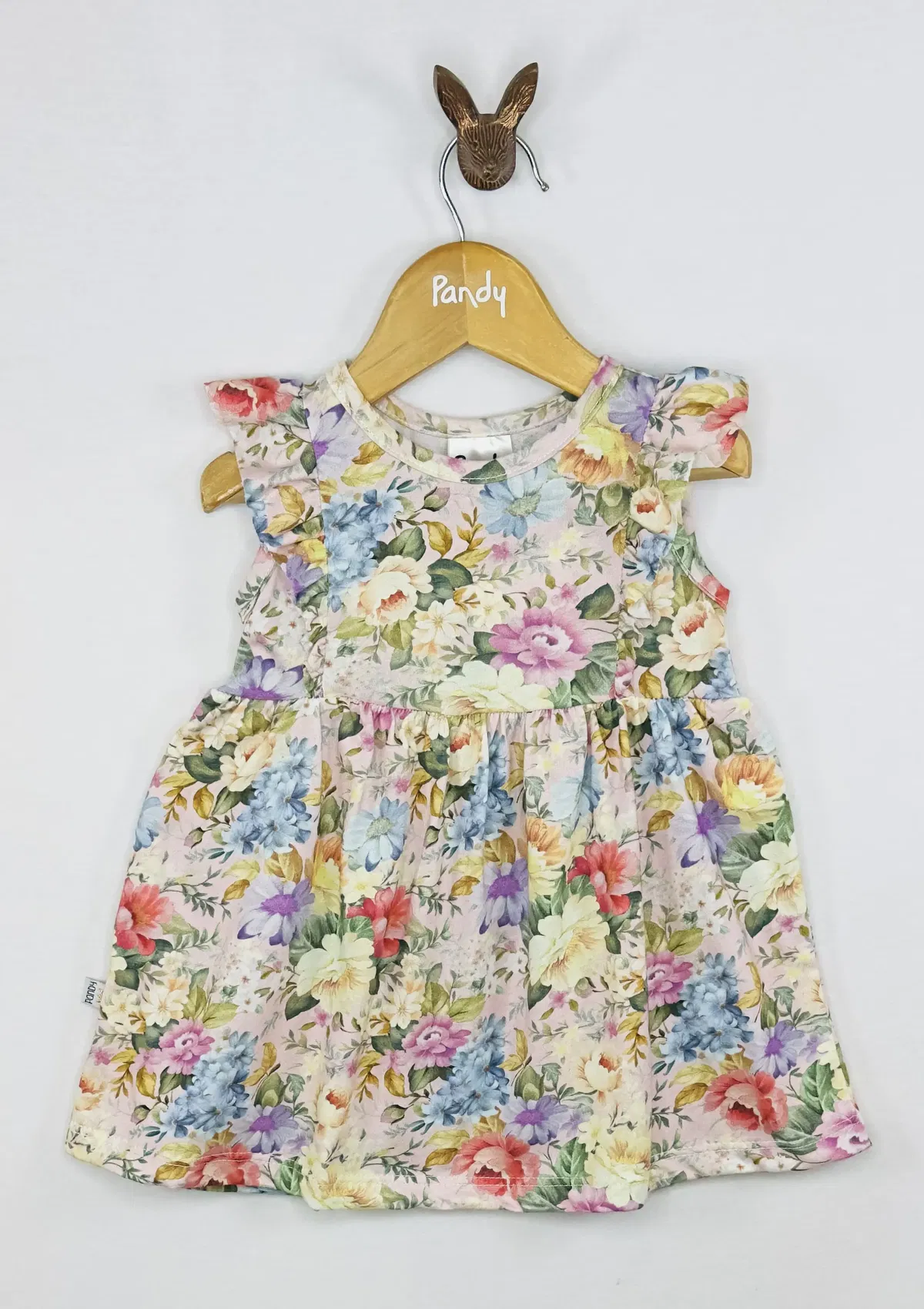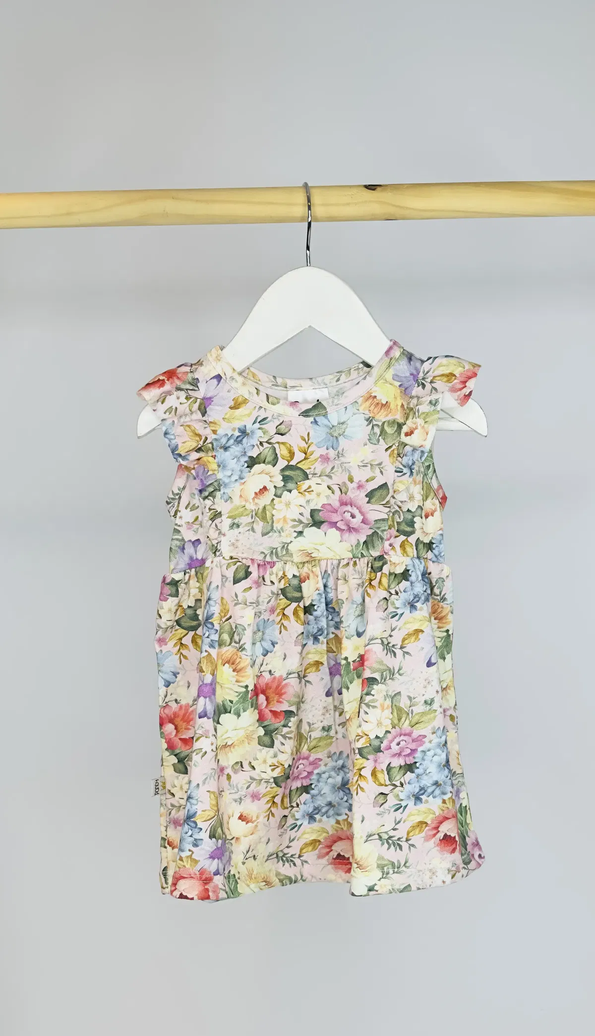 Vestido beba jersey 100% algodón estampado con volados en las mangas.
