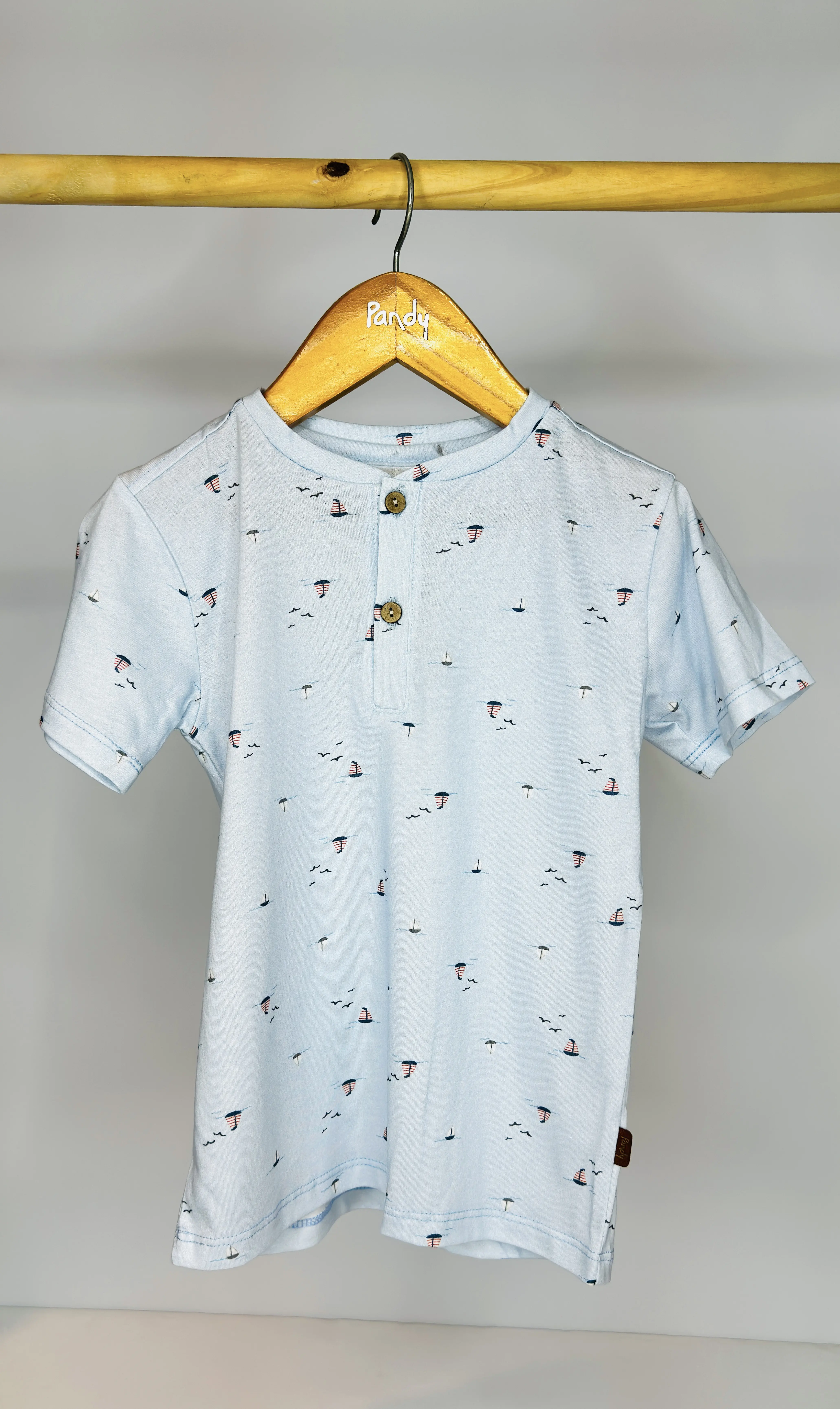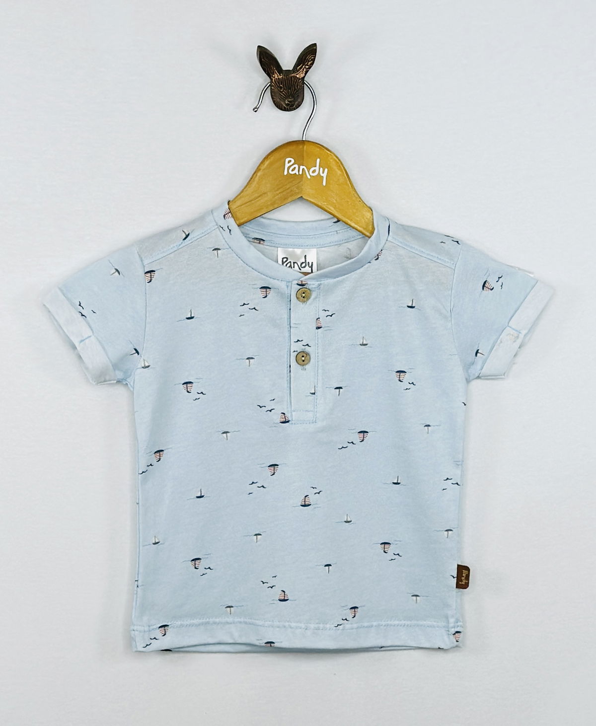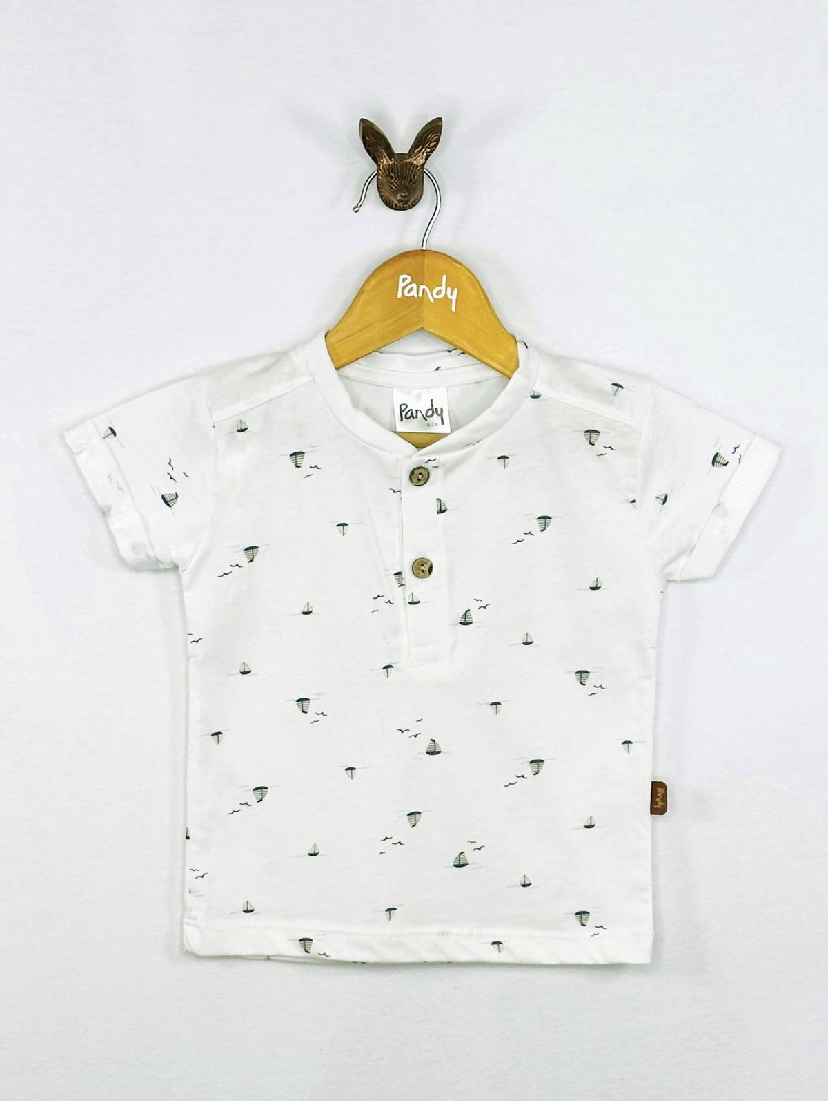Remera bebe jersey estampado, con cartera y botones simil madera, detelle en manga, dobladillo con atraque.