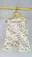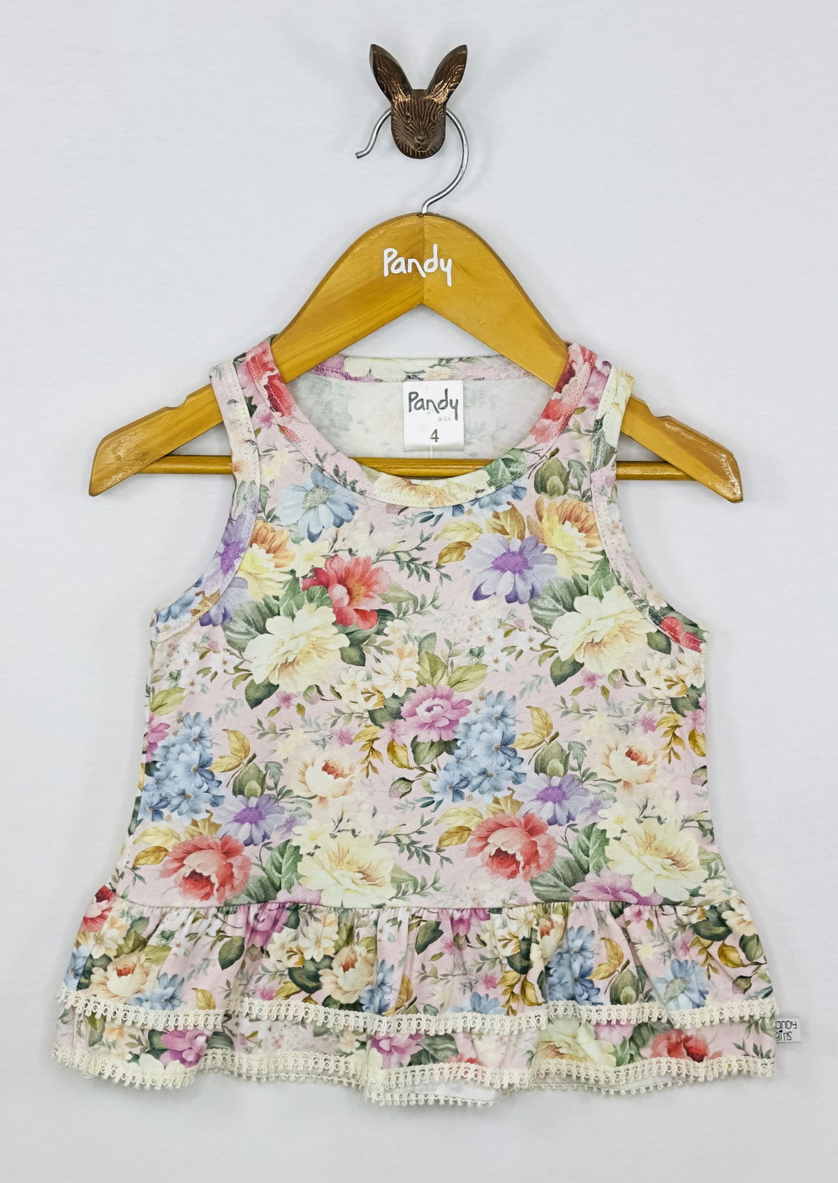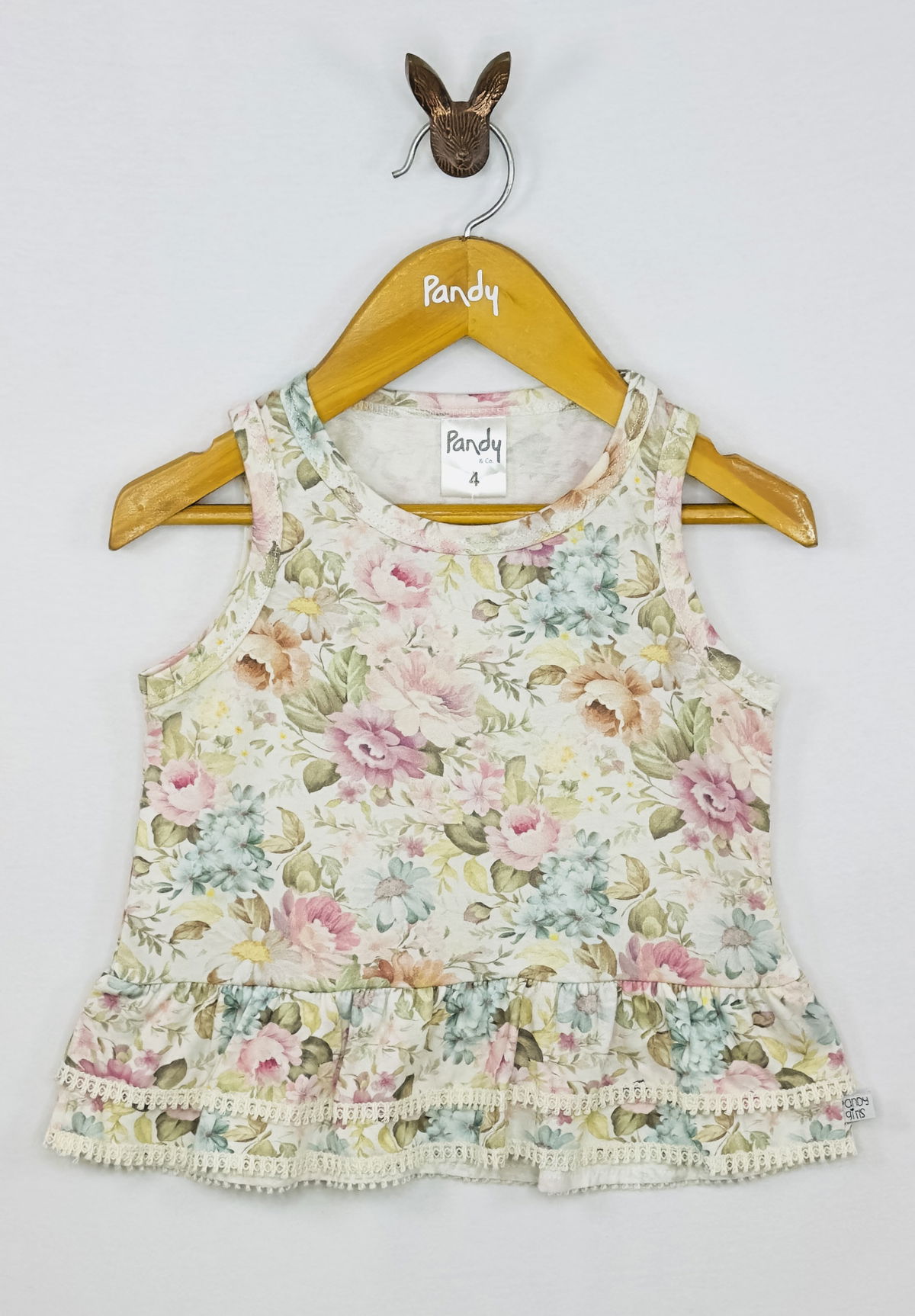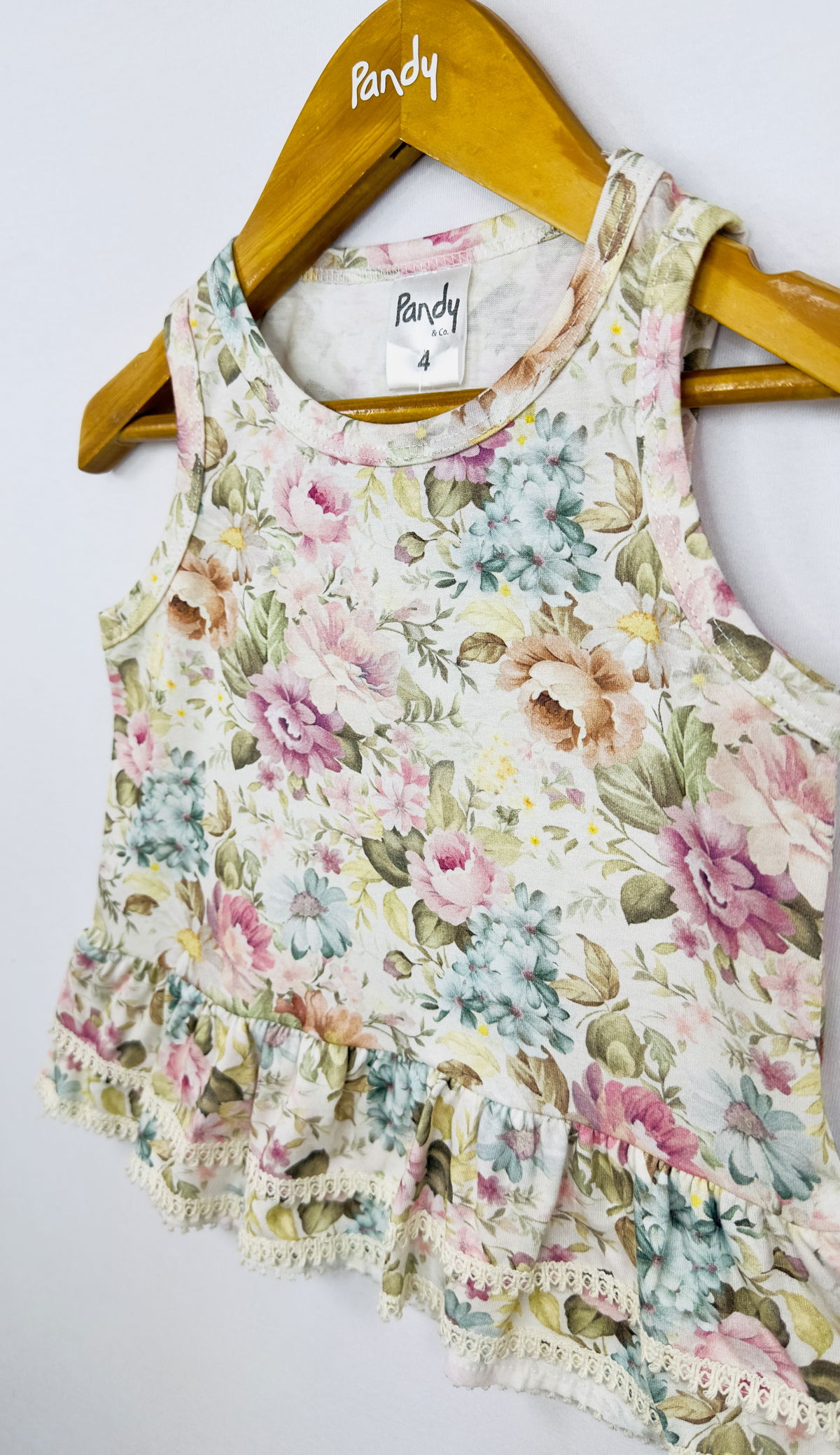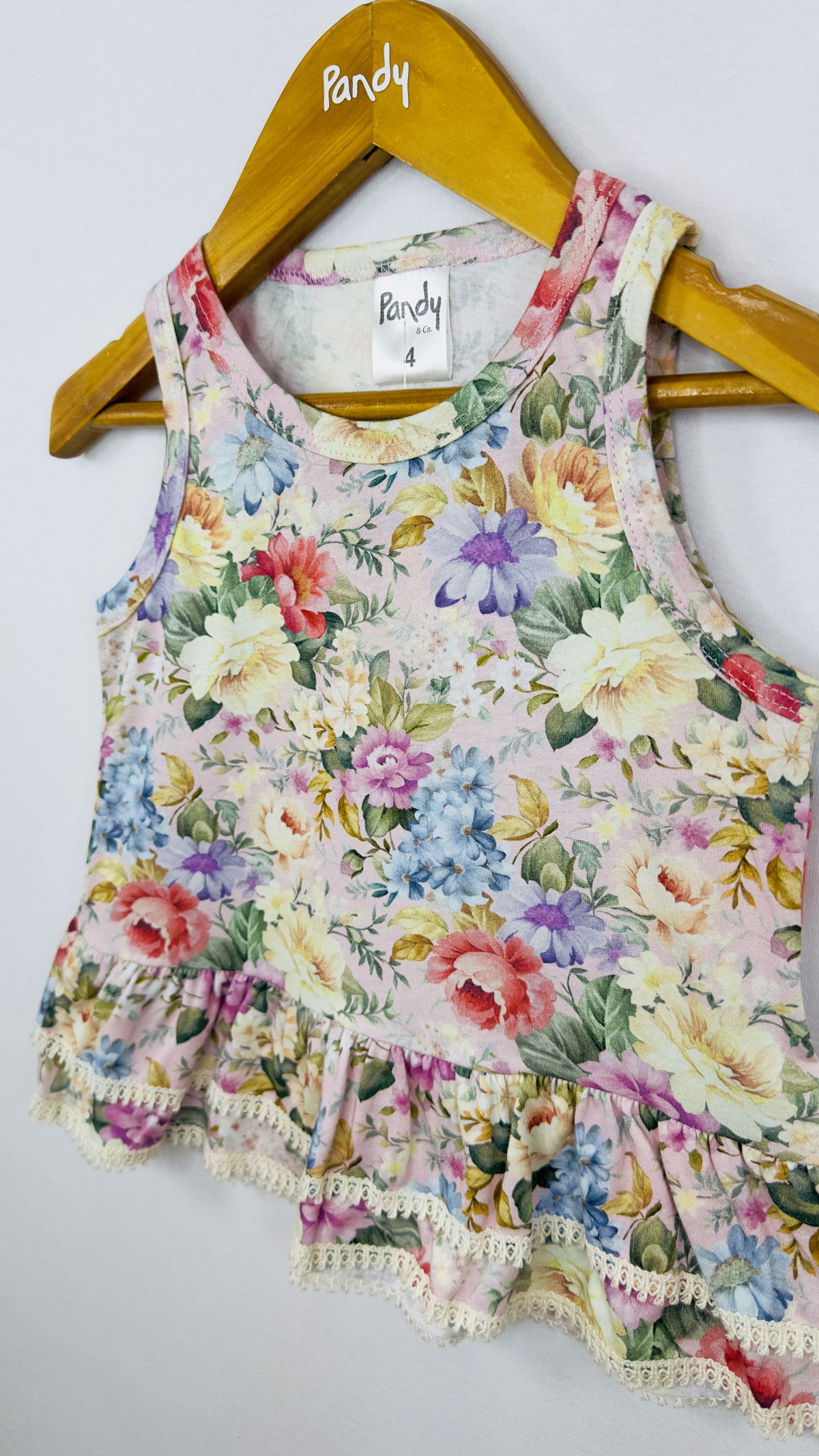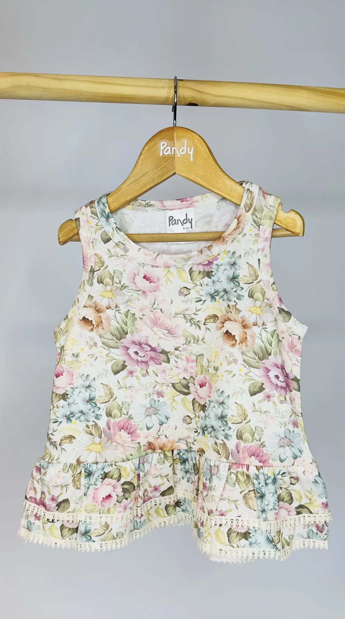 Musculosa Nena corta jersey estampado con flores.Doble volado con aplique de puntilla cruda de algodón.