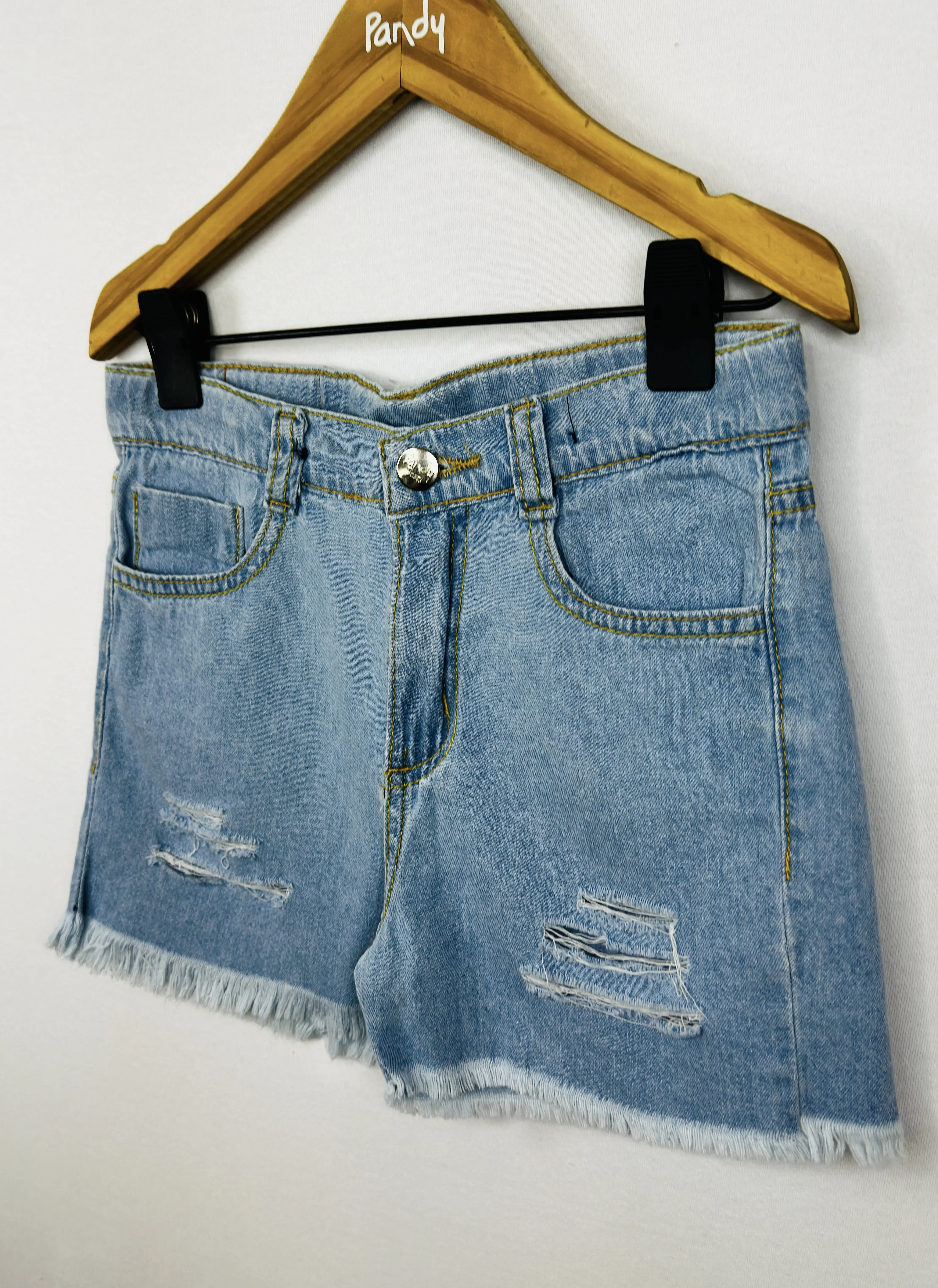 Short nena Jean con roturas en delatero. Localizado. Cintura con elastico regulable.
