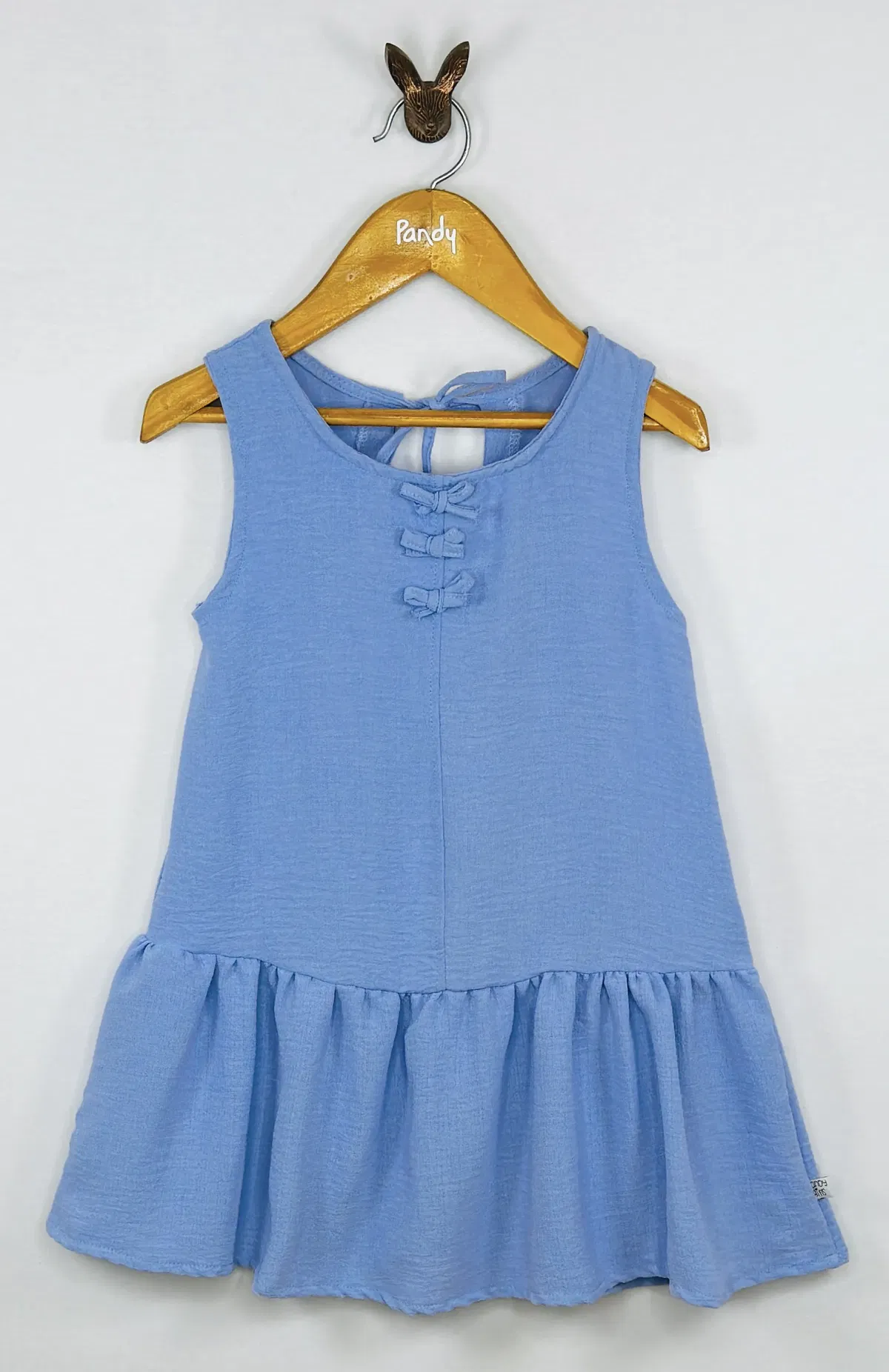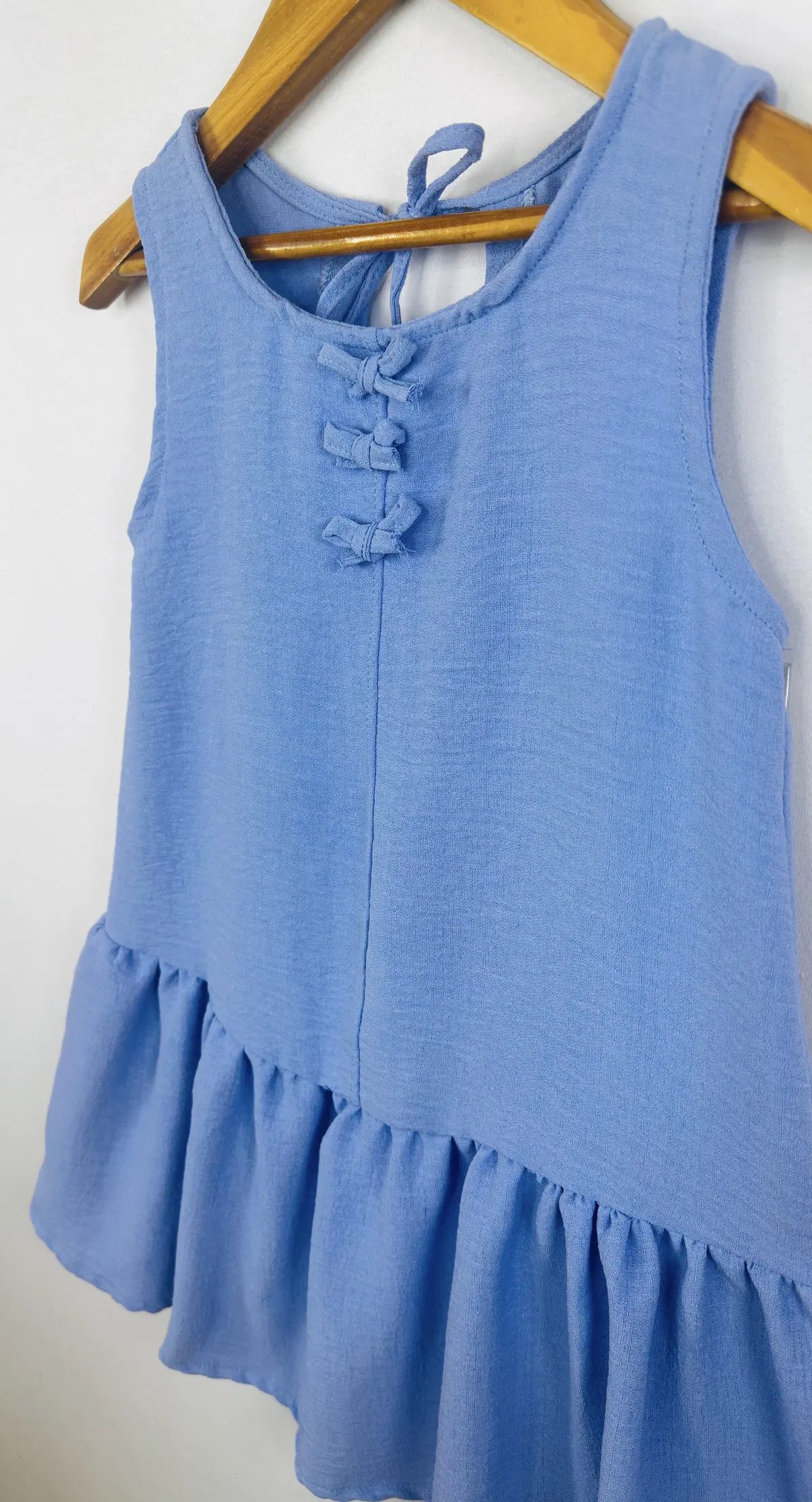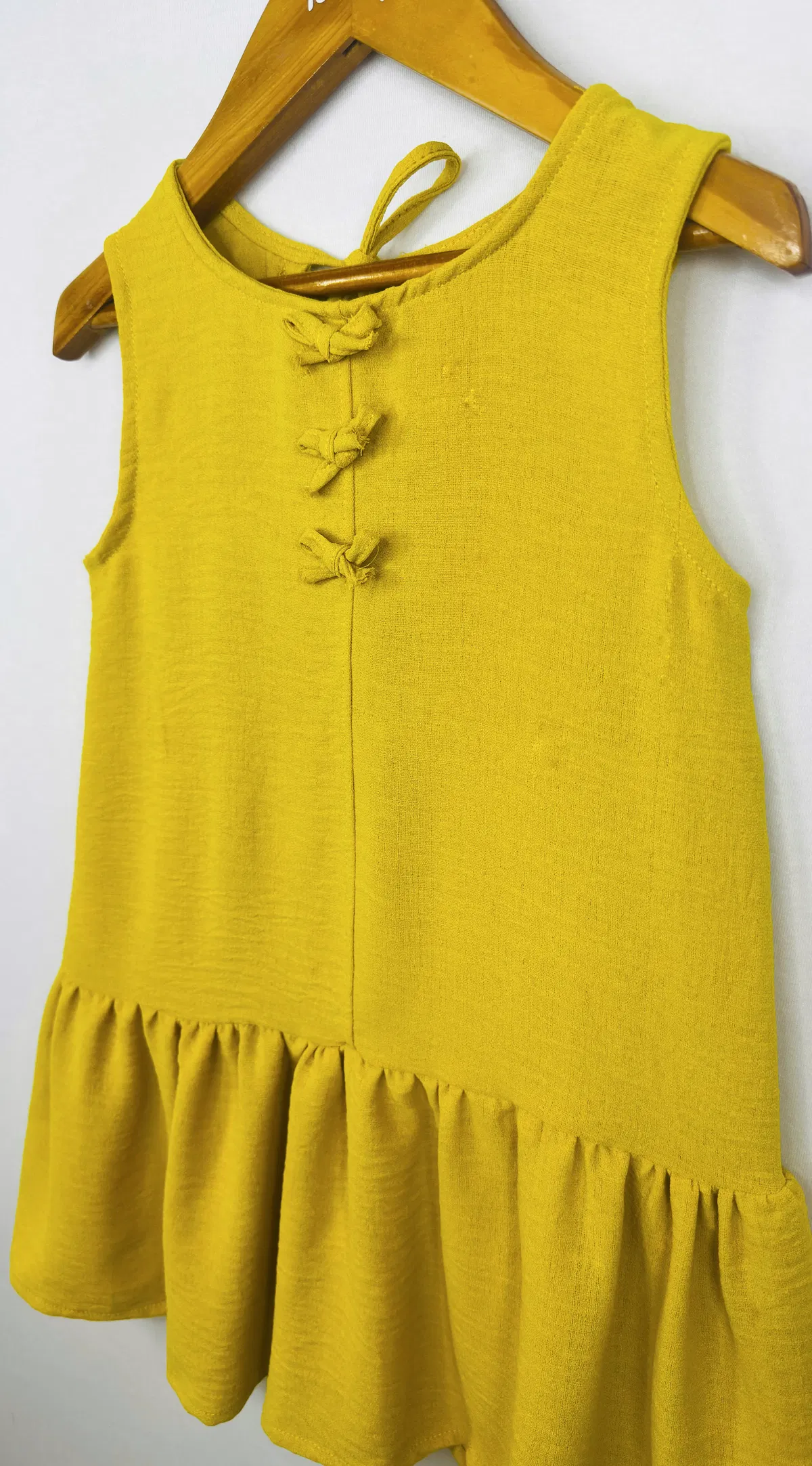 Vestido Nena en simil Lino, con volado y aplique de moños de la misma tela. espalda con gota y lazo para atar.