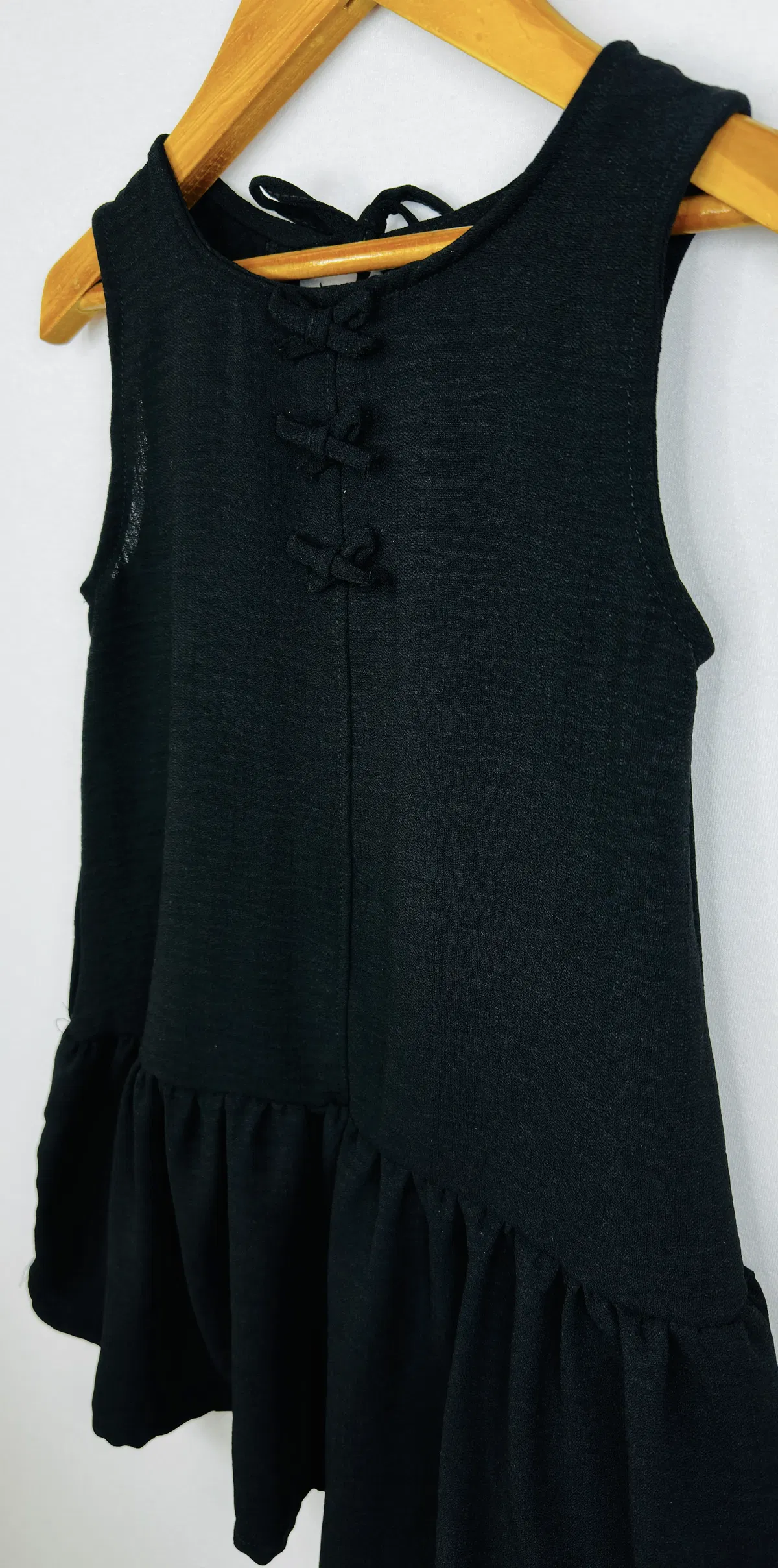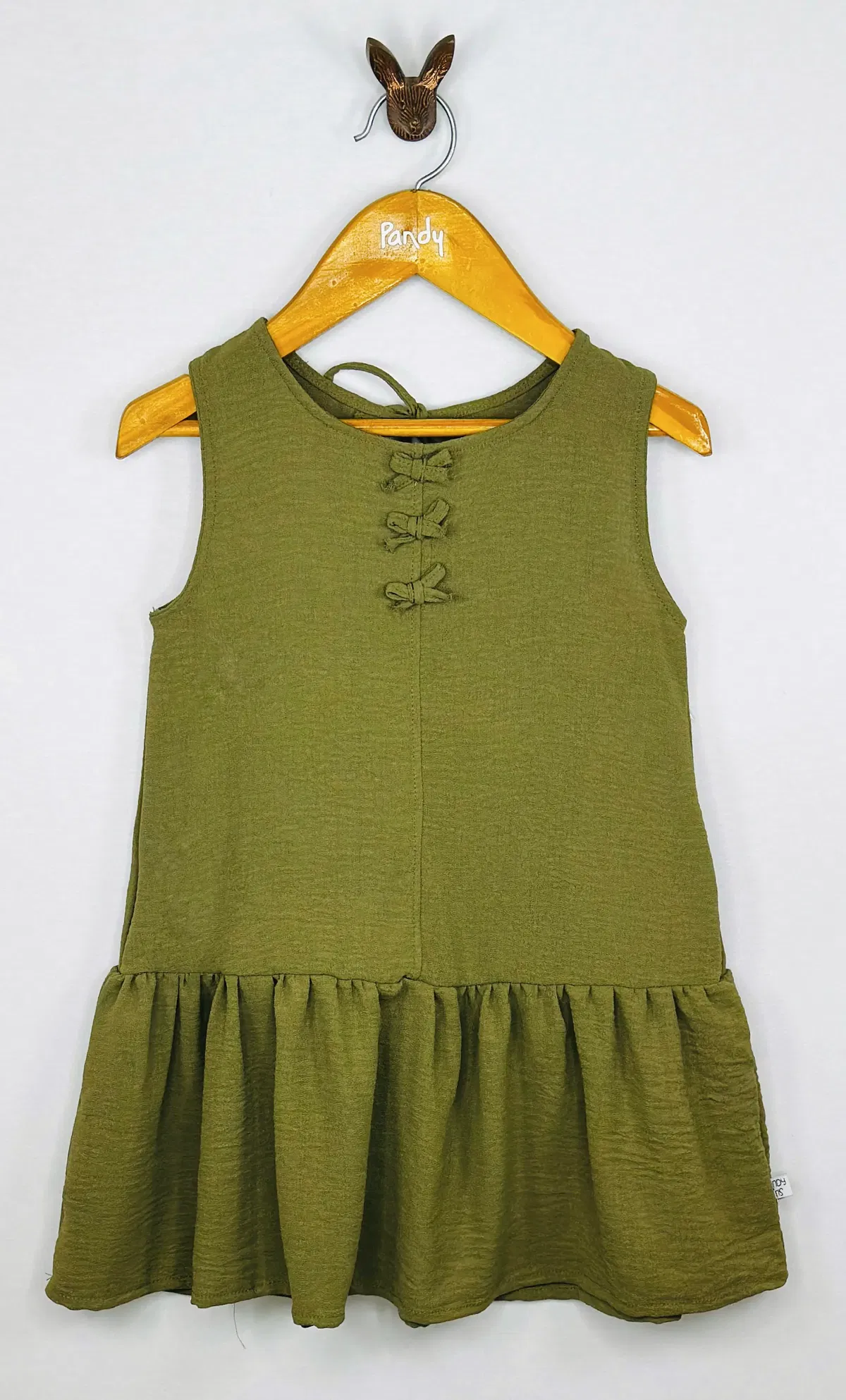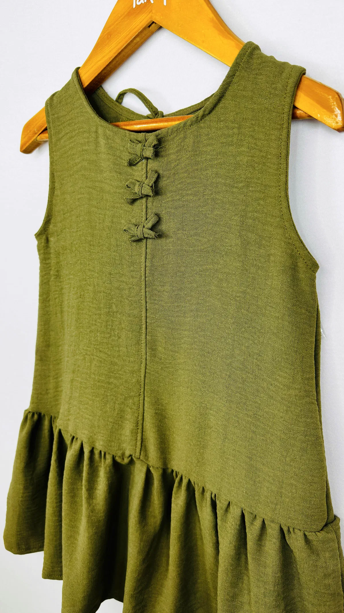 Vestido Nena en simil Lino, con volado y aplique de moños de la misma tela. espalda con gota y lazo para atar.