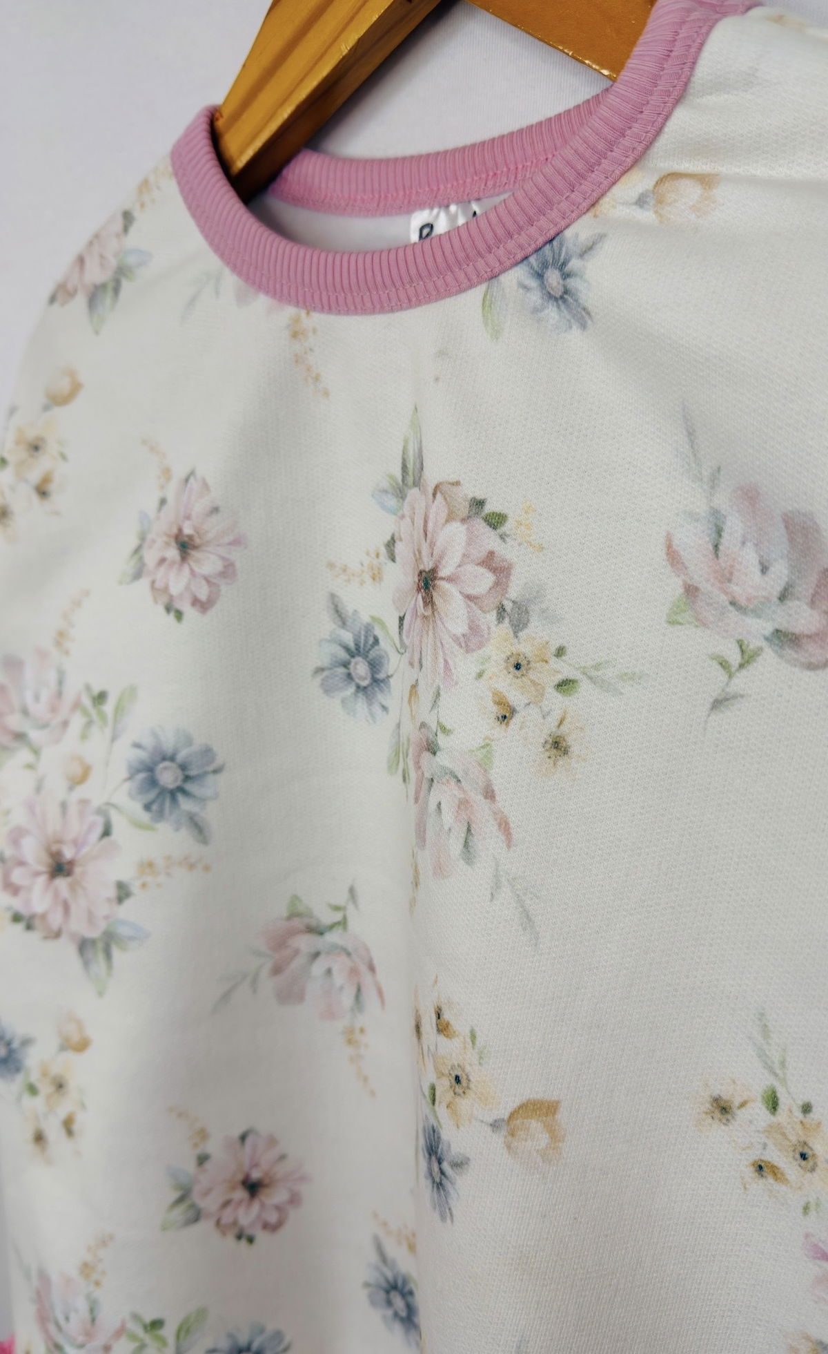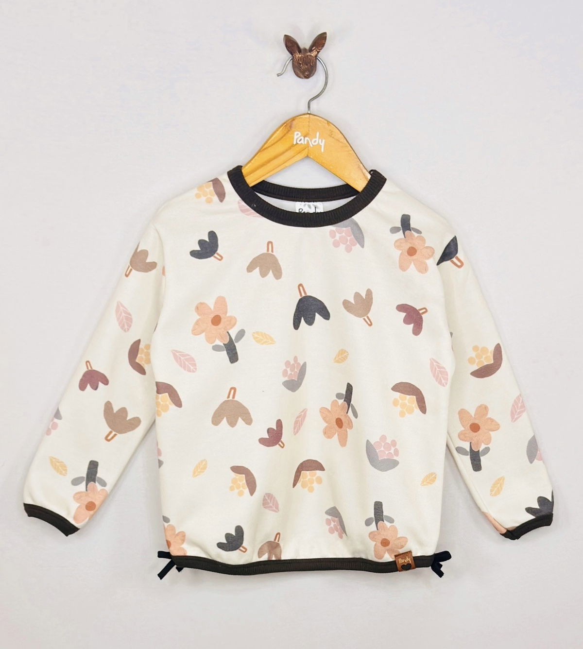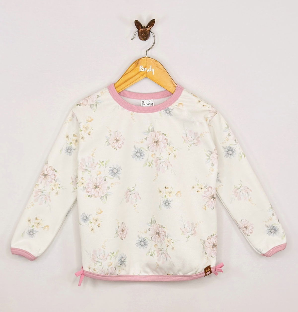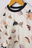 Cuello a la base con cuello, puños y cintura emboquillado al tono de la estampa con moño en ruedo lateral.