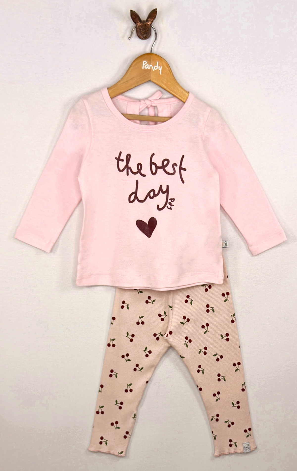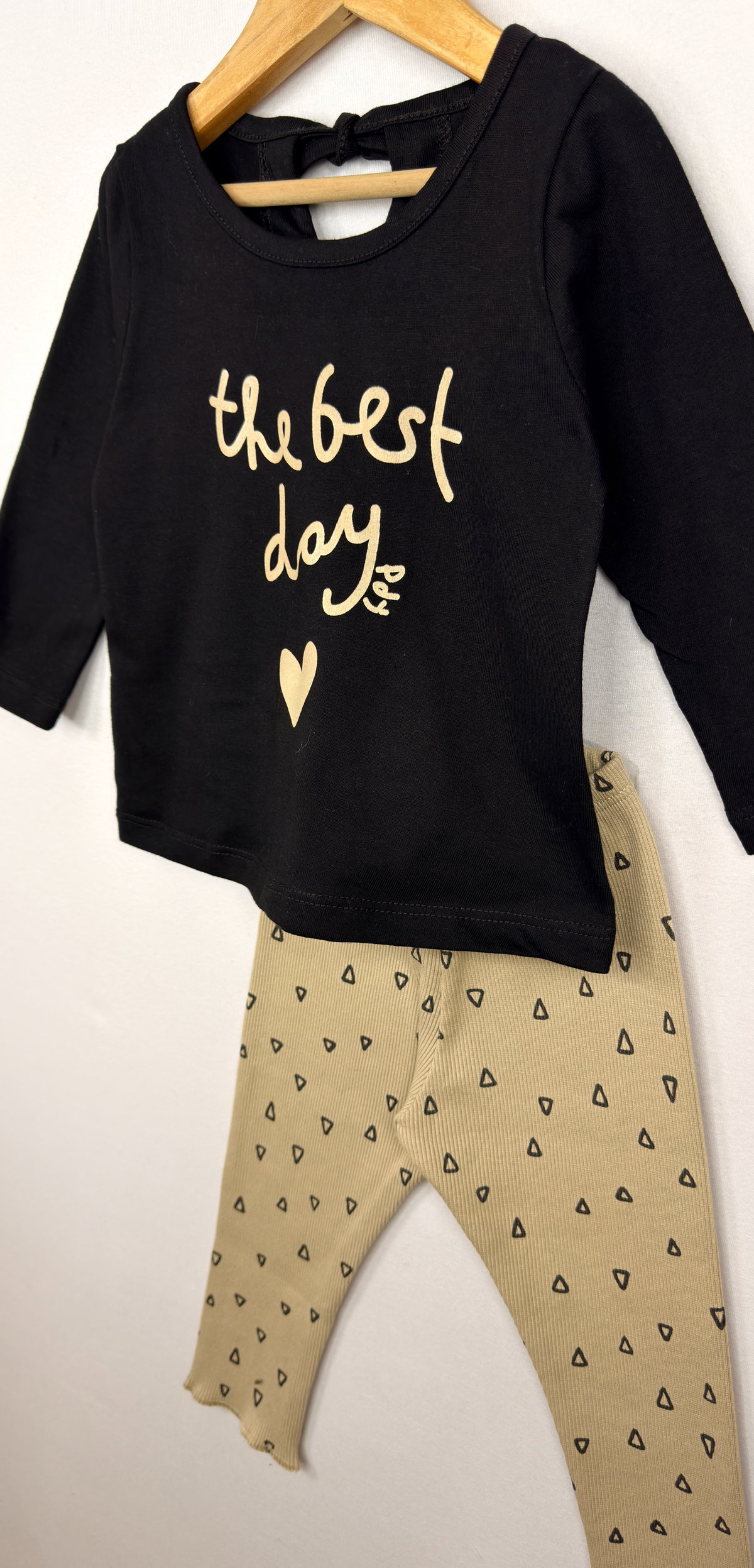 Conjunto Beba de calza de morley pesado estampado + remera manga larga de jersey 100% algodón con estampa en delantero y gota en espalda.